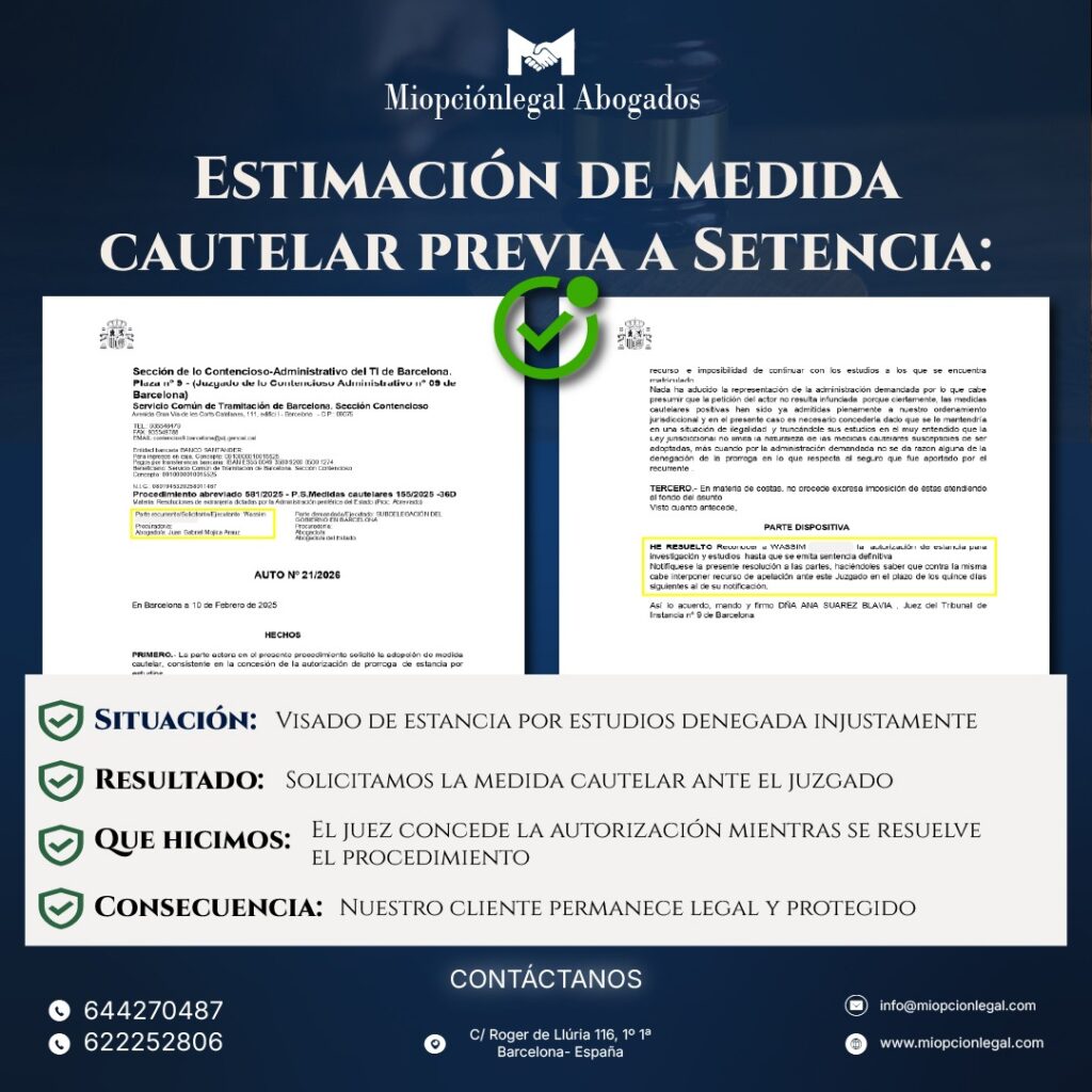 El juez admite mi solicitud de medida cautelar en la que concede a nuestro cliente la autorización de estancia por estudios que le fue denegada, haciendo caso a nuestras alegaciones y no así a las del Abogado del Estado.